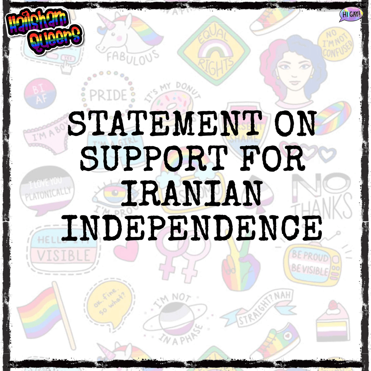 We at Hailsham Queers wish to add our voices to the calls for international intervention in this ongoing genocide. We would like to publicly state that our members stand in solidarity with the Iranian people, in the same way that we stand with the Palestinian people. The LGBT+ community are currently undergoing their own threats to bodily autonomy and freedom of choice, and therefore reject any efforts to subjugate groups of people through violent (or other) means. All of us share the same concerns regarding the consequences of refusing to address such blatant human rights violations.